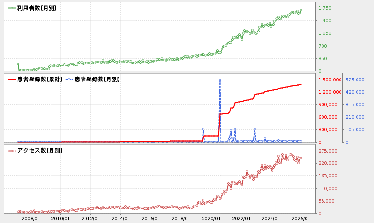 ※ 一部施設で2019年7月,2020年8月,2021年5月,8月より施設内の全患者登録を開始したため、登録患者数が大幅に増えています。